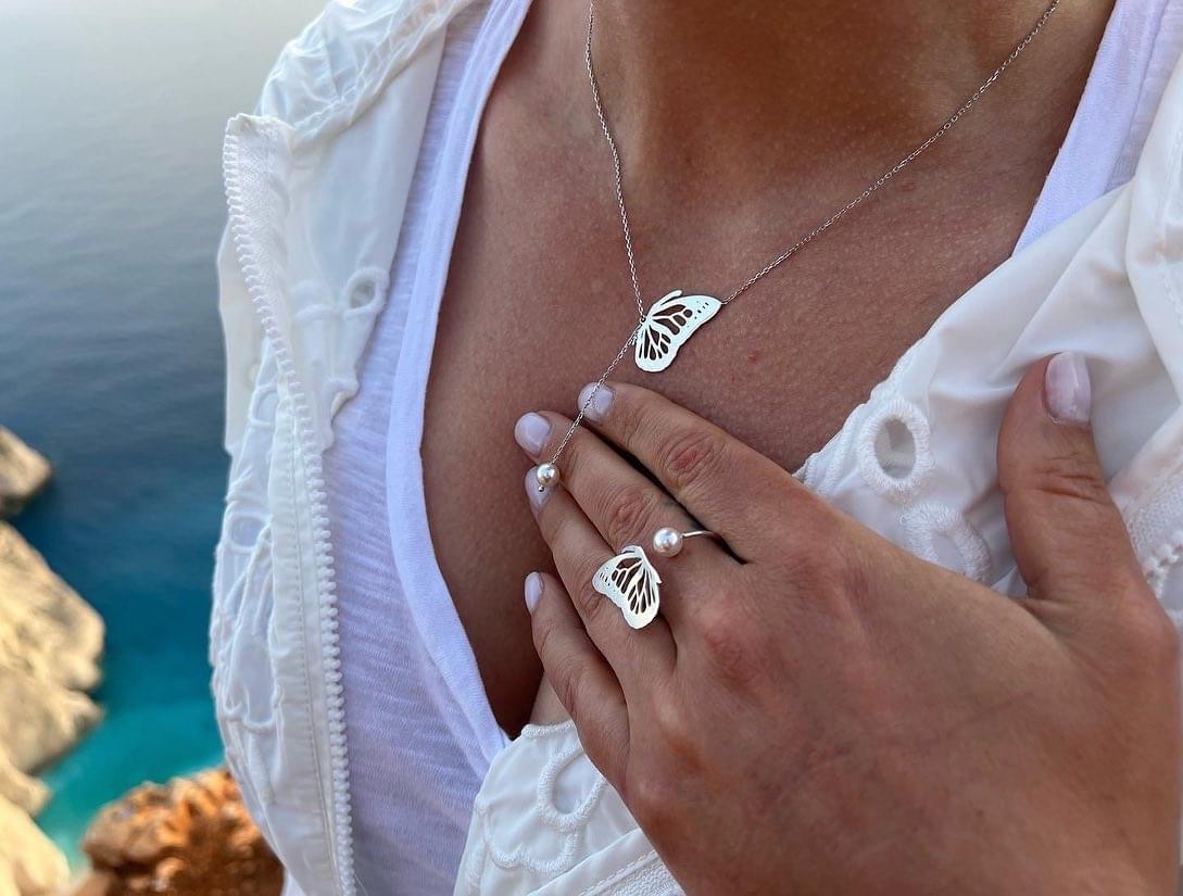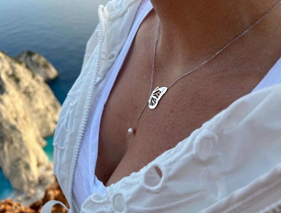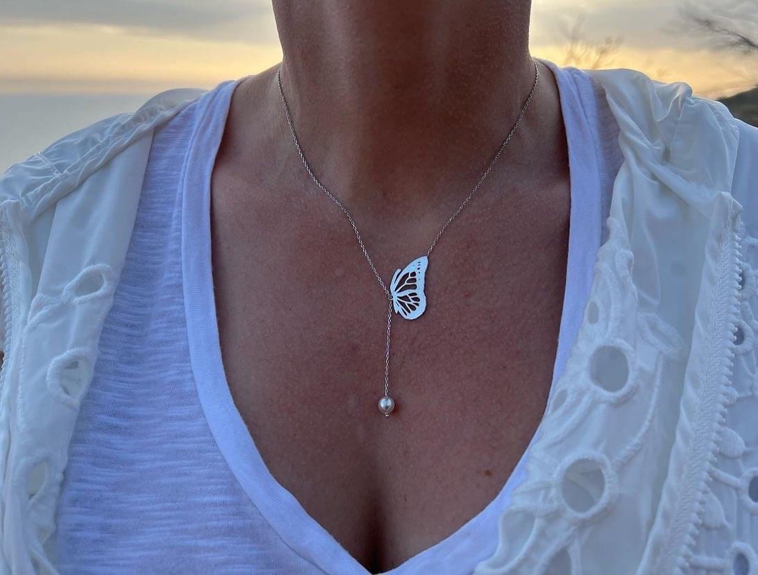 Κολιέ με μενταγιόν πεταλούδα και μαργαριταριο . Η αλυσίδα του βγαίνει σε όλα τα μεγέθη για να ταιριάξει σε κάθε σωματότυπο. Το μενταγιόν έχει ύψος 25 Χιλιοστά και το μαργαριταριο διαμετρο 8mm