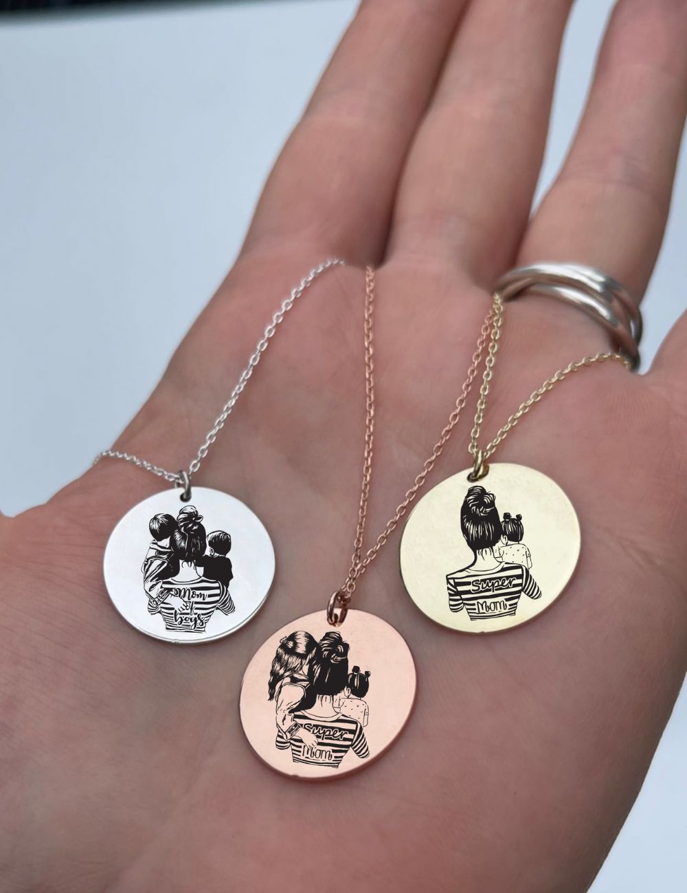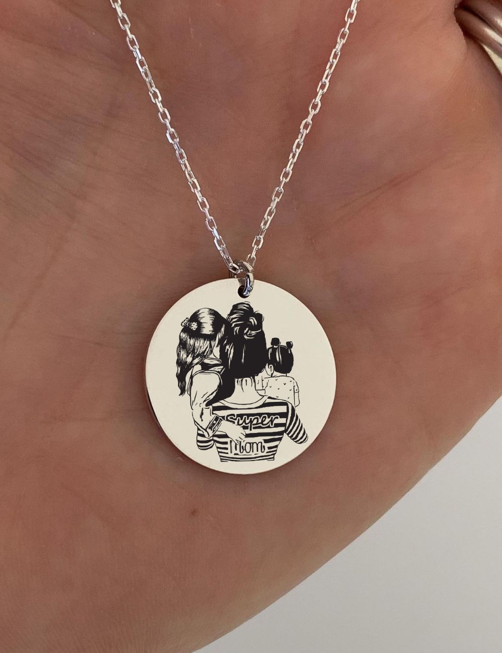 Το μενταγιόν με τη χάραξη «Σούπερ Μαμά» κατασκευάζεται από ασήμι 925 ή επιχρυσωμένο ασήμι 925 με χρυσό 14Κ.